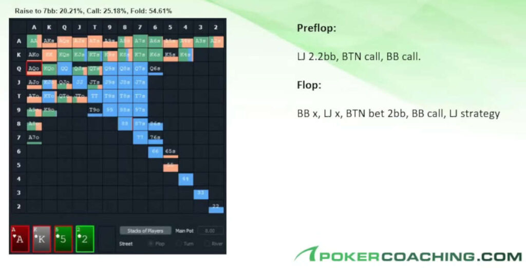 We open from the LJ with AQ, the button and the big blind call, and the flop comes AK5. After the big blind checks, we can mix between checking and betting, and this time we decide to check.