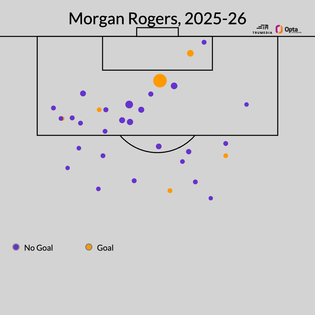 There’s one main reason why Villa are 11 points clear of sixth place, more than halfway through the season: Rogers has gone nuclear. Here’s his shot map so far this season:
