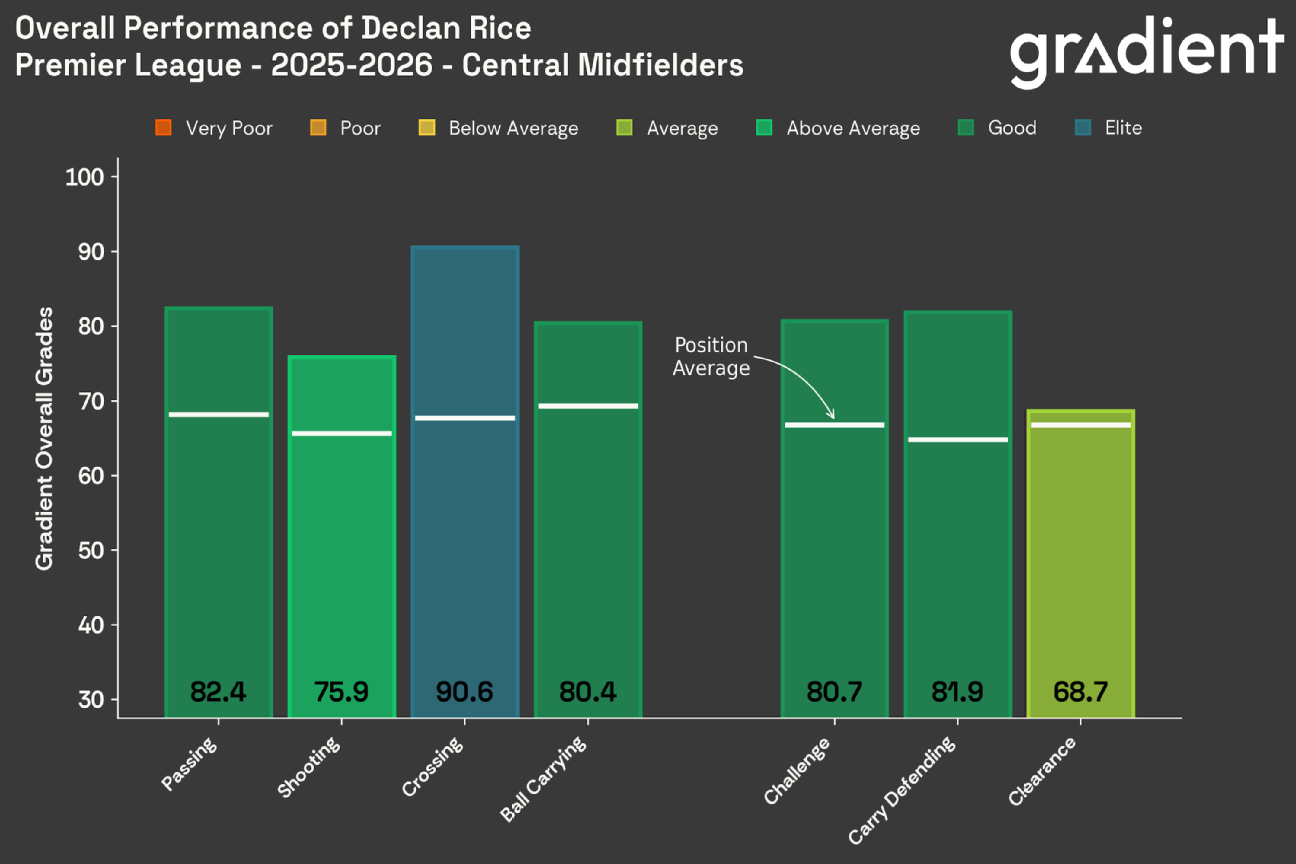 But here are some stats just to confirm what you see every weekend. The company Gradient Spots grades every action by every player in the Premier League each weekend, across a number of categories, and then they normalize the grades on a 0-100 scale. The six major ones, to my mind, are passing, shooting, crossing, carrying, defending carries, and making challenges. And there is only one player in the league who grades out at a 75 or better in all six categories: